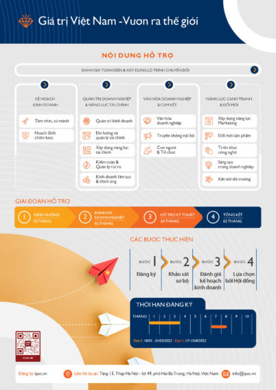 - Gói hỗ trợ 06: GIÁ TRỊ VIỆT NAM VƯƠN RA THẾ GIỚI – dành cho các doanh nghiệp tiên phong. Nội dung chính là Hỗ trợ đánh giá toàn diện và Xây dựng lộ trình chuyển đổi doanh nghiệp. Nội dung chi tiết xin xem qua ảnh dưới đây